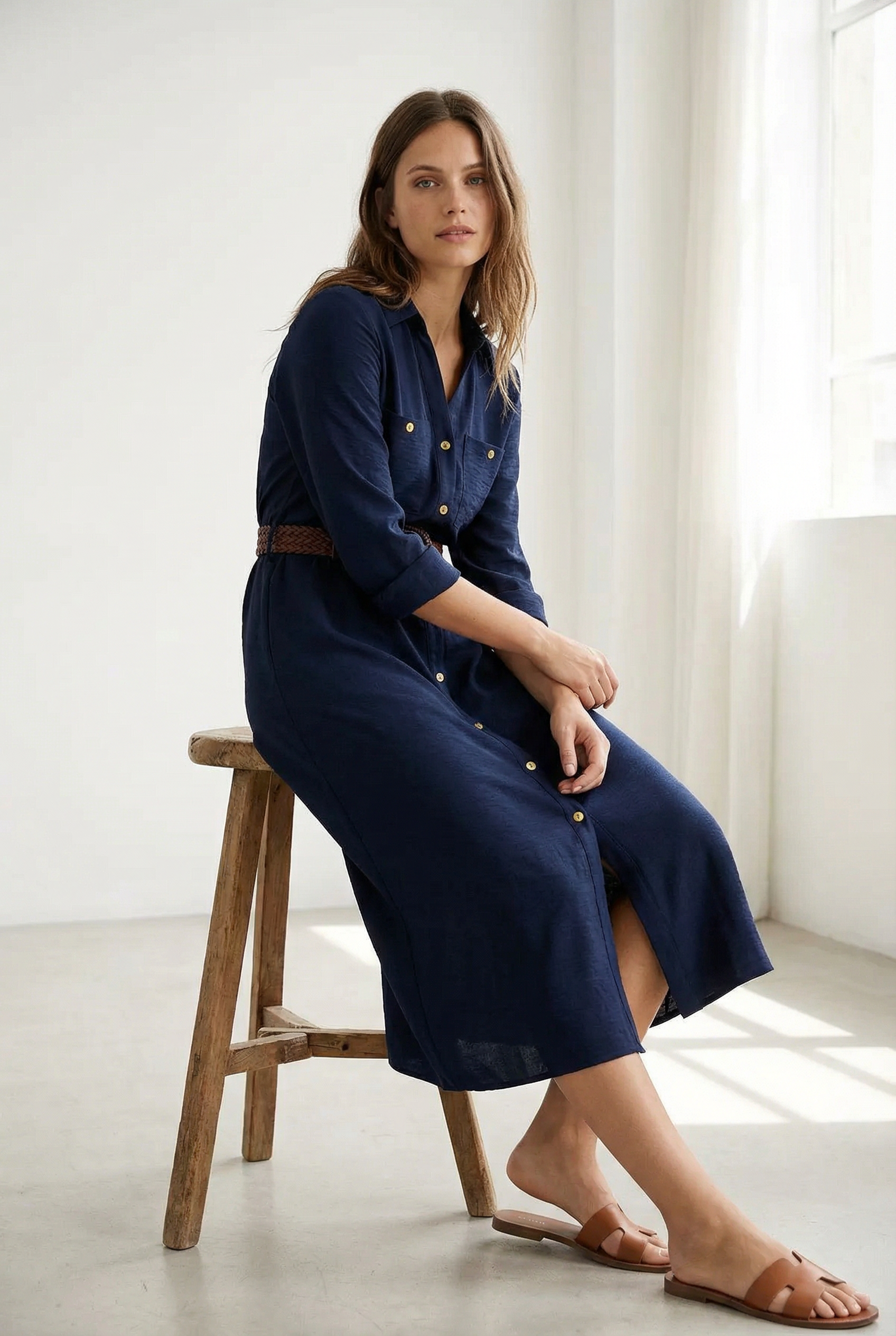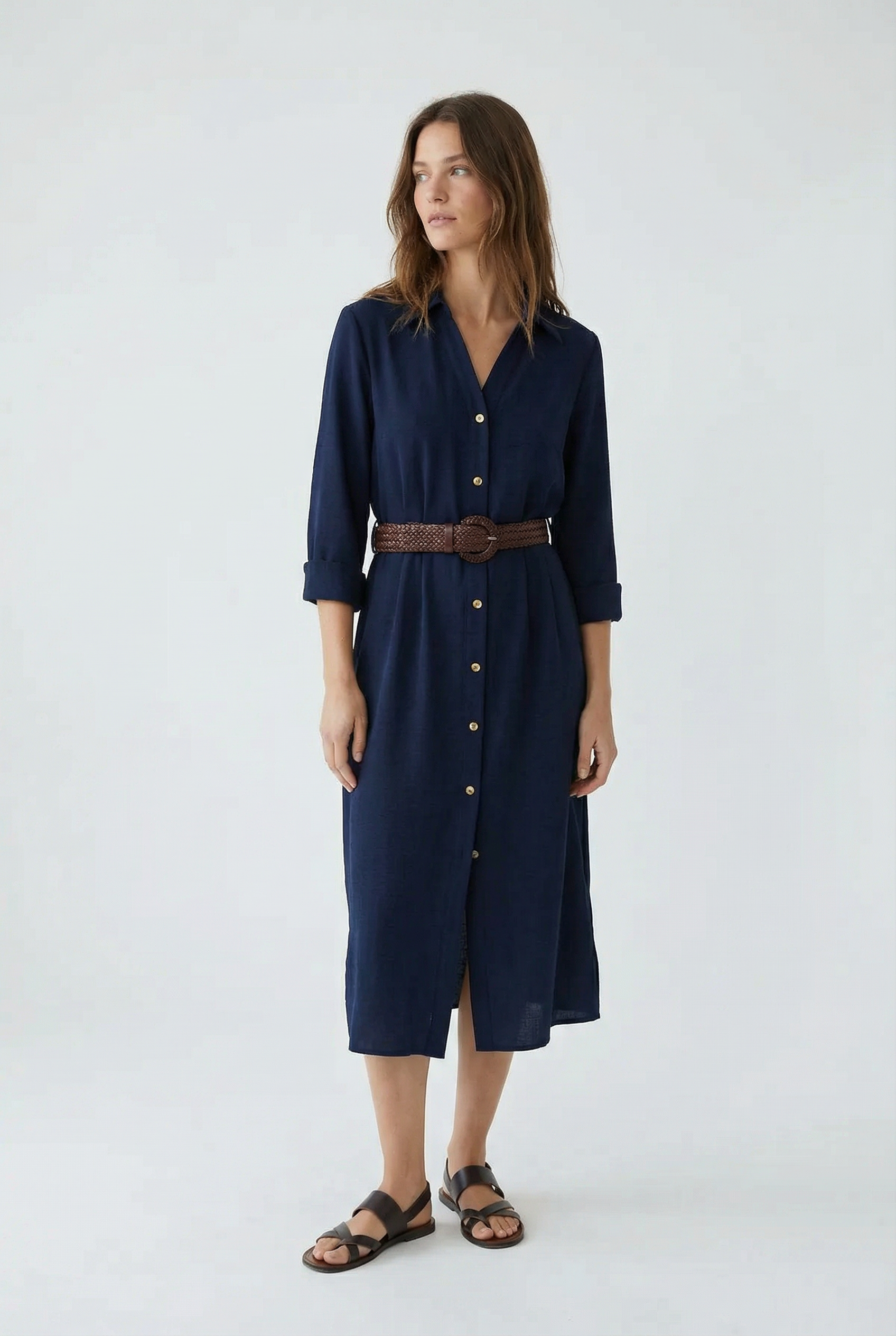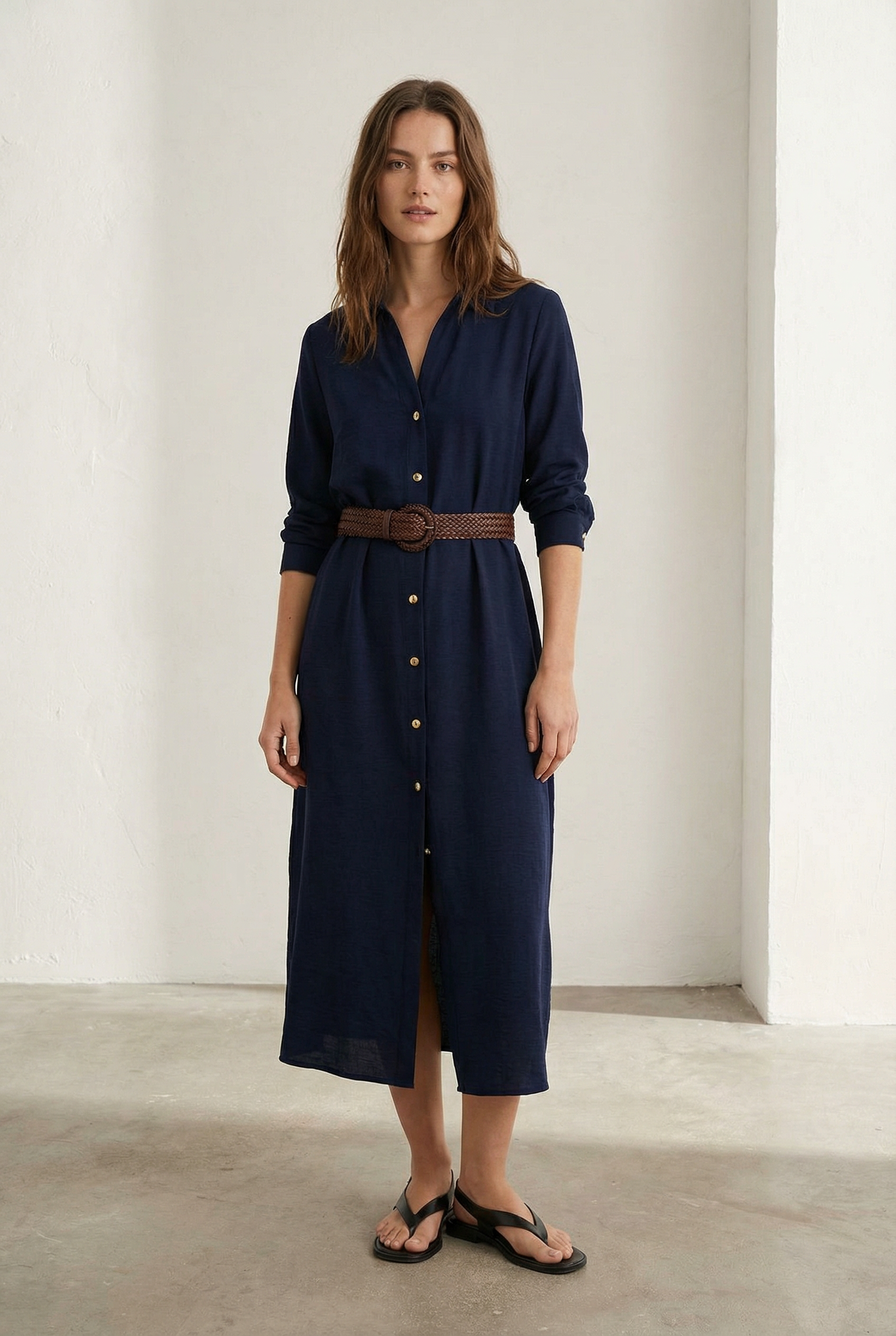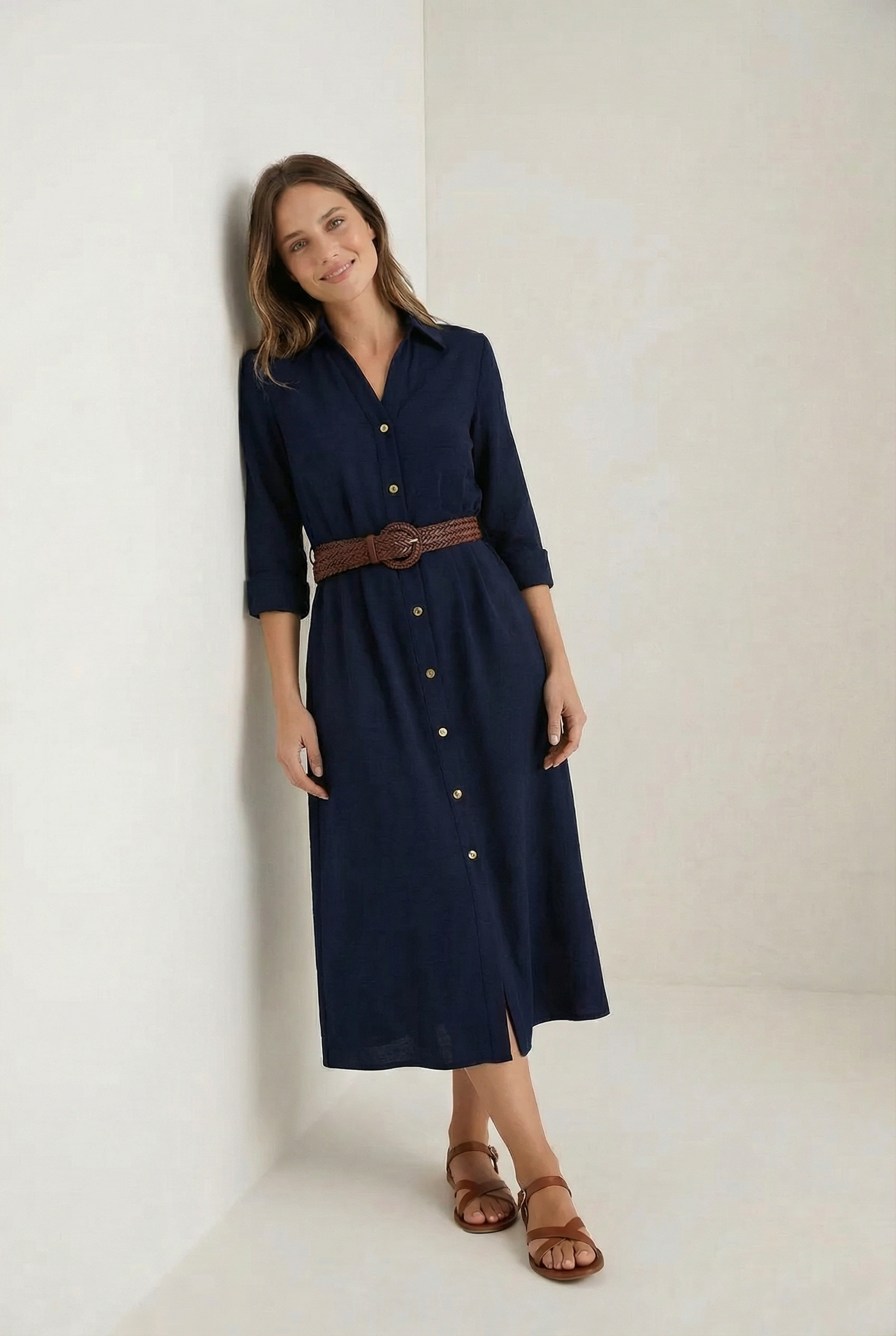 Robe Chemise Longue Bleu Marine Avec Ceinture Tressée