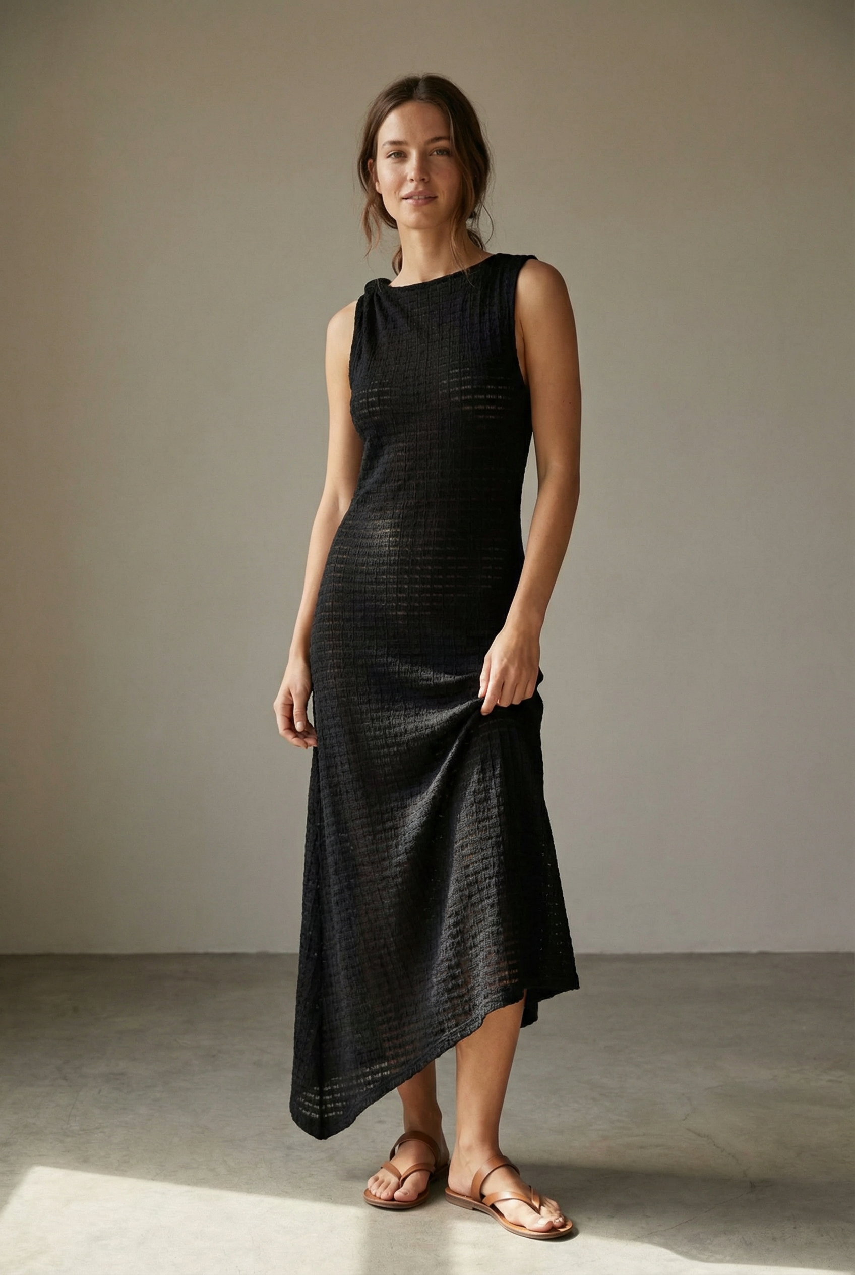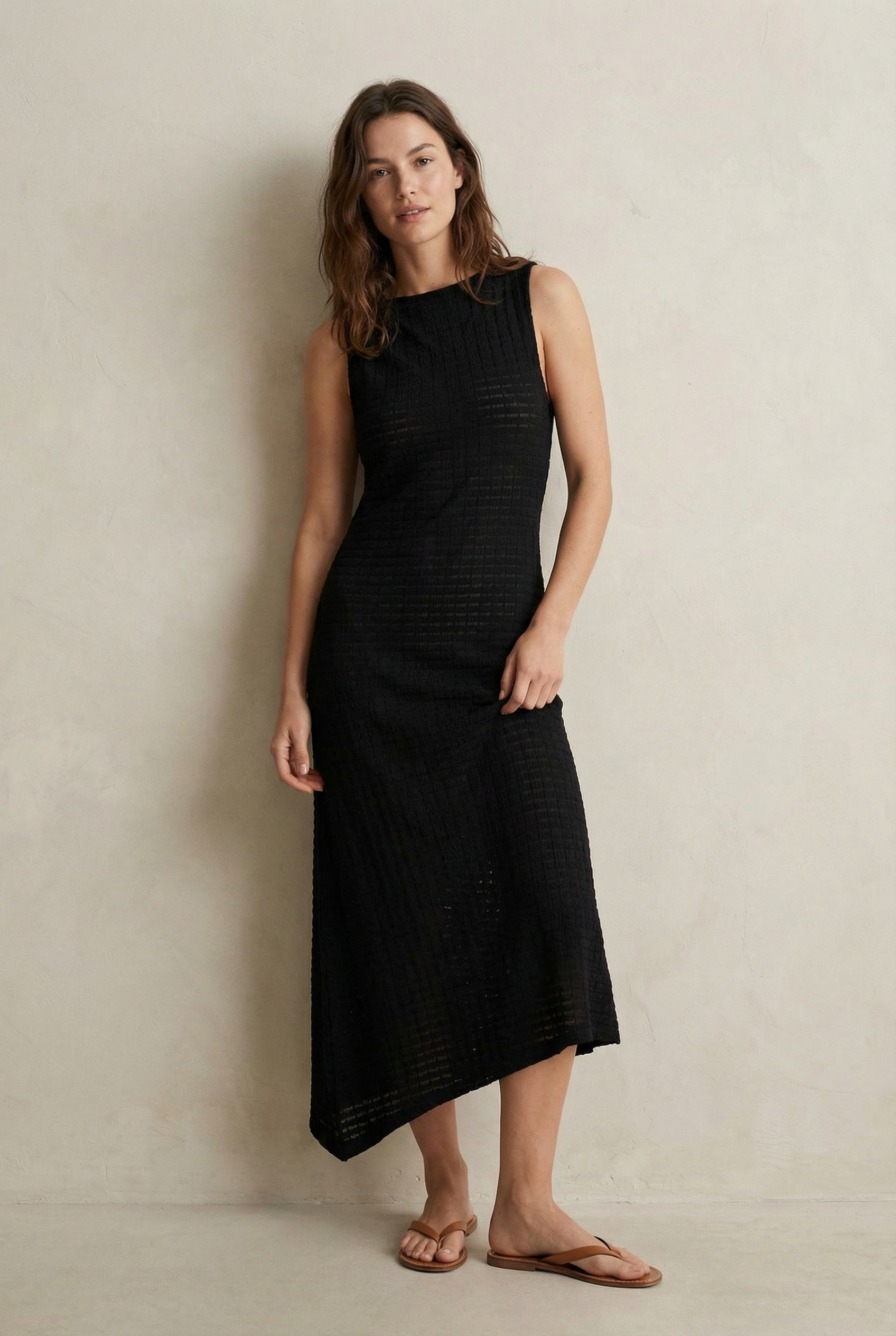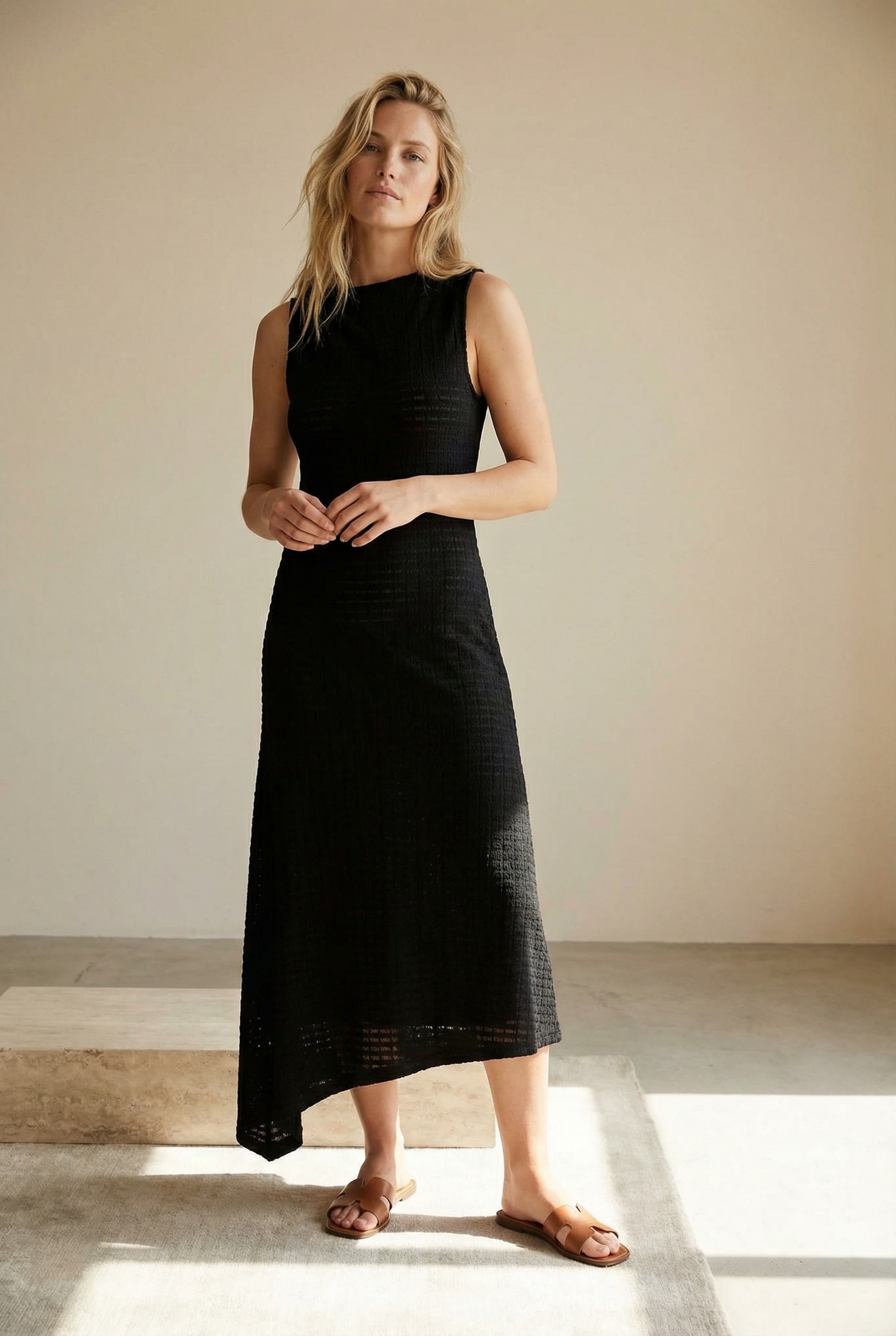 Robe midi noire sans manches ourlet festonné