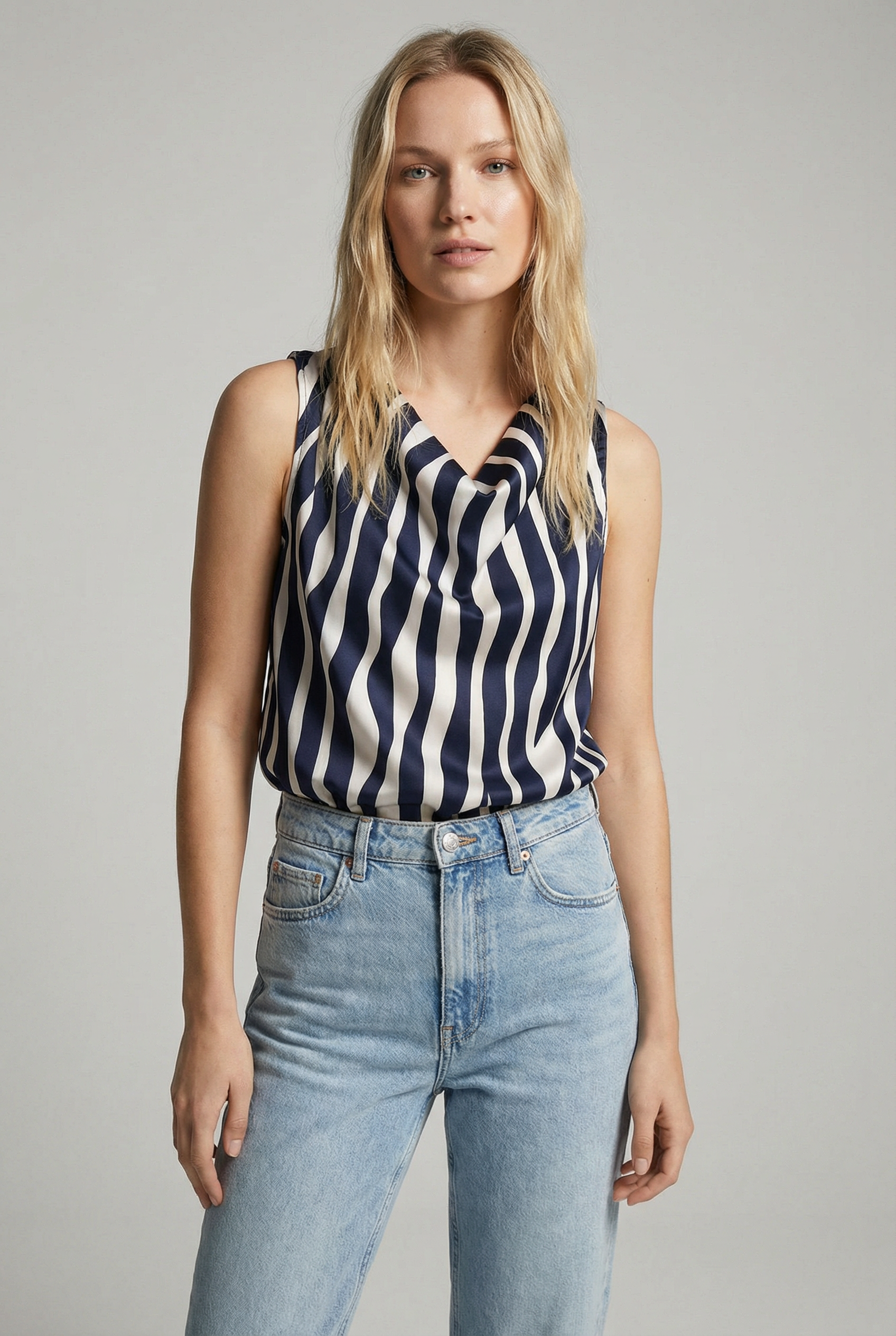 Top satiné à rayures bleu marine