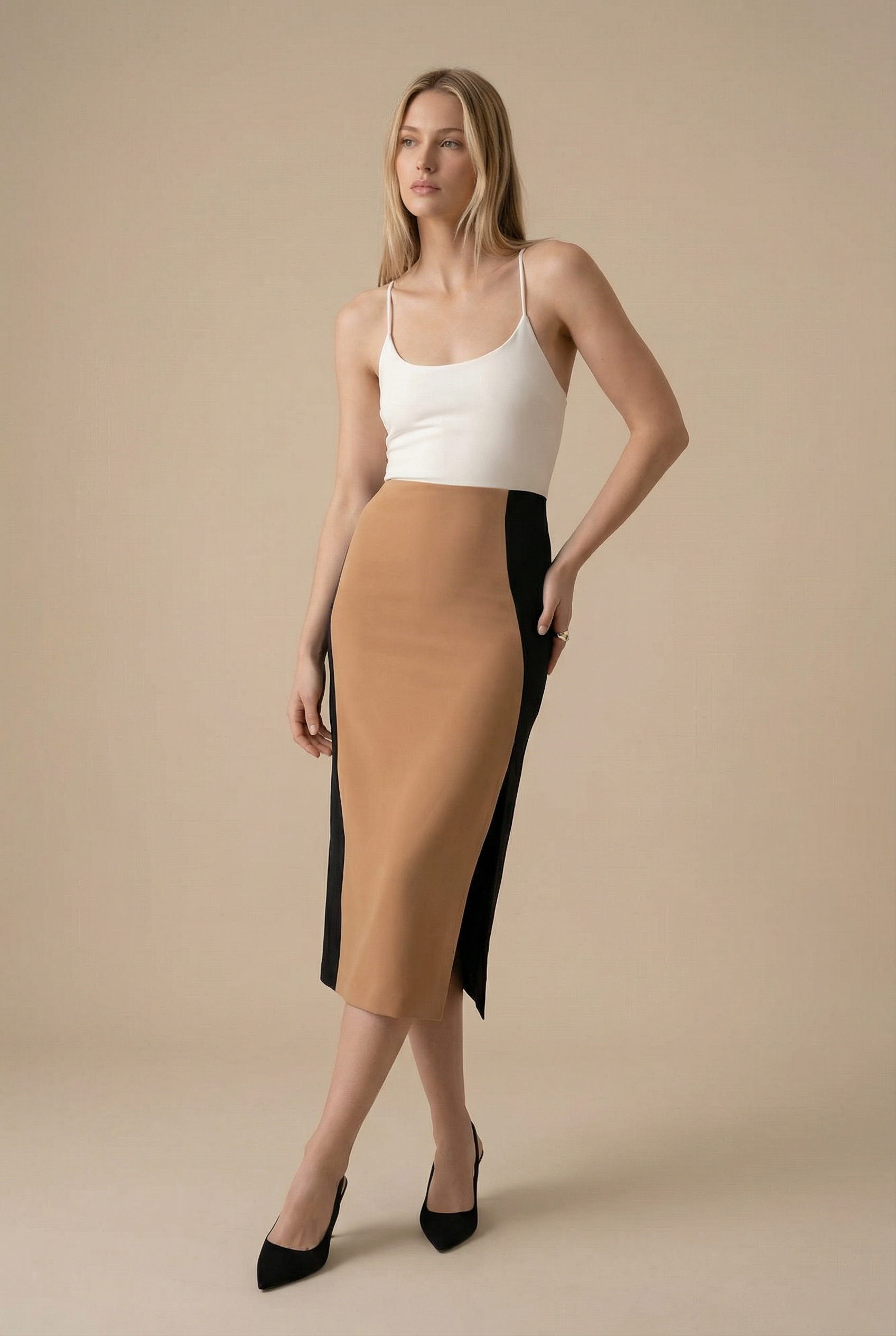 Vestido bloque bicolor midi con tirantes