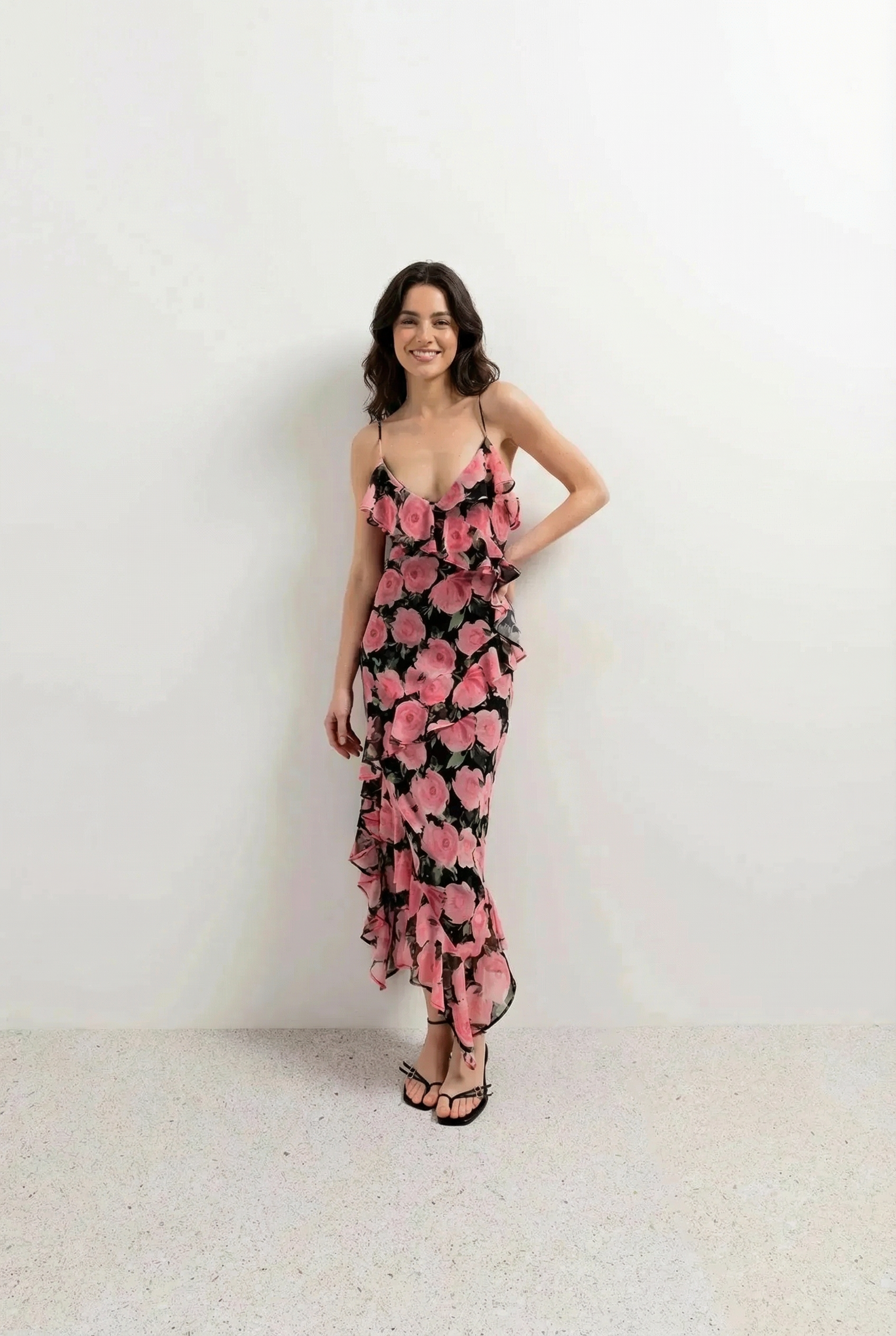 Vestido largo fluido de lunares marrones con volantes y tirantes ajustables