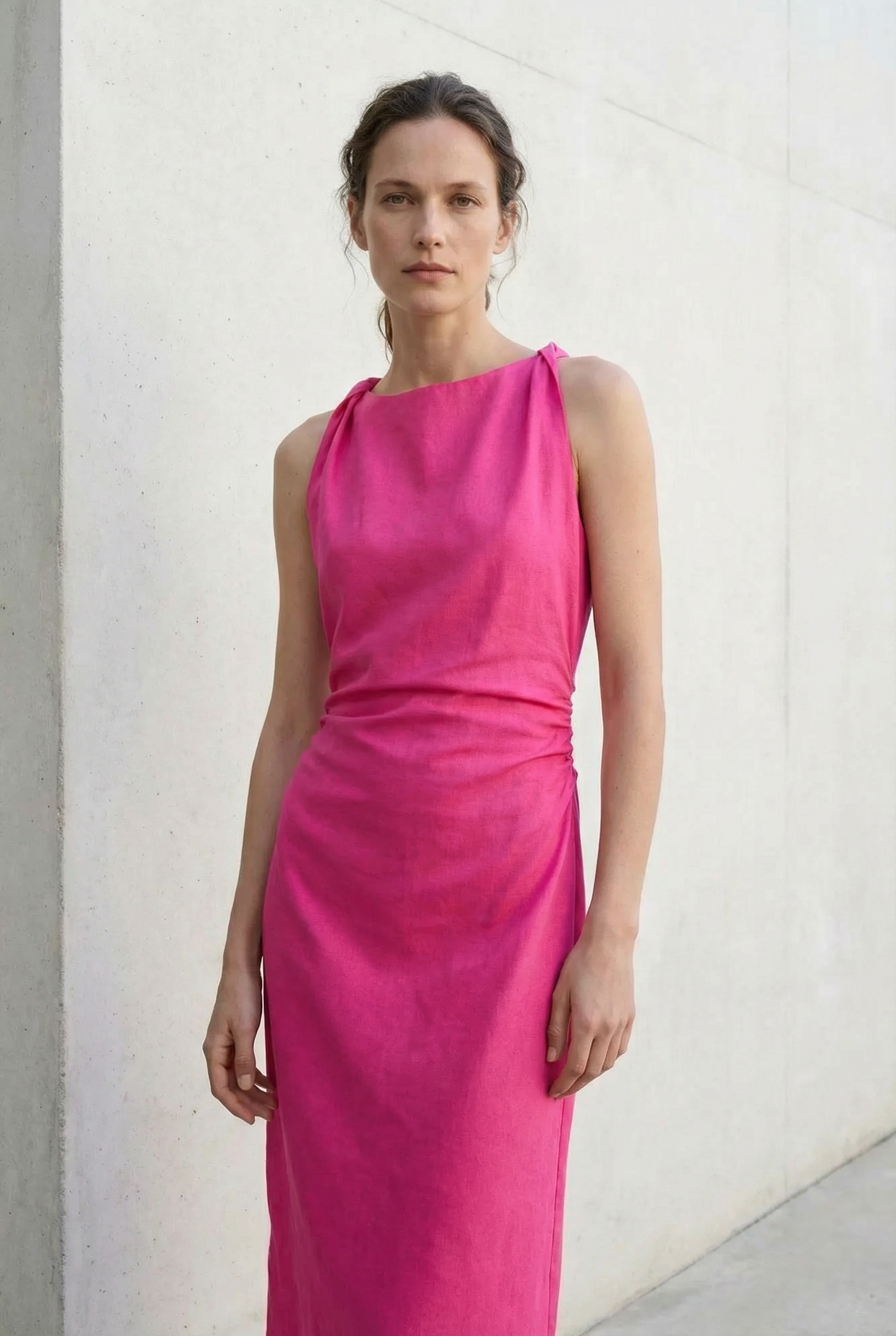 Elegante vestido largo de lino fucsia, sin mangas, escote fruncido, estilo minimalista.