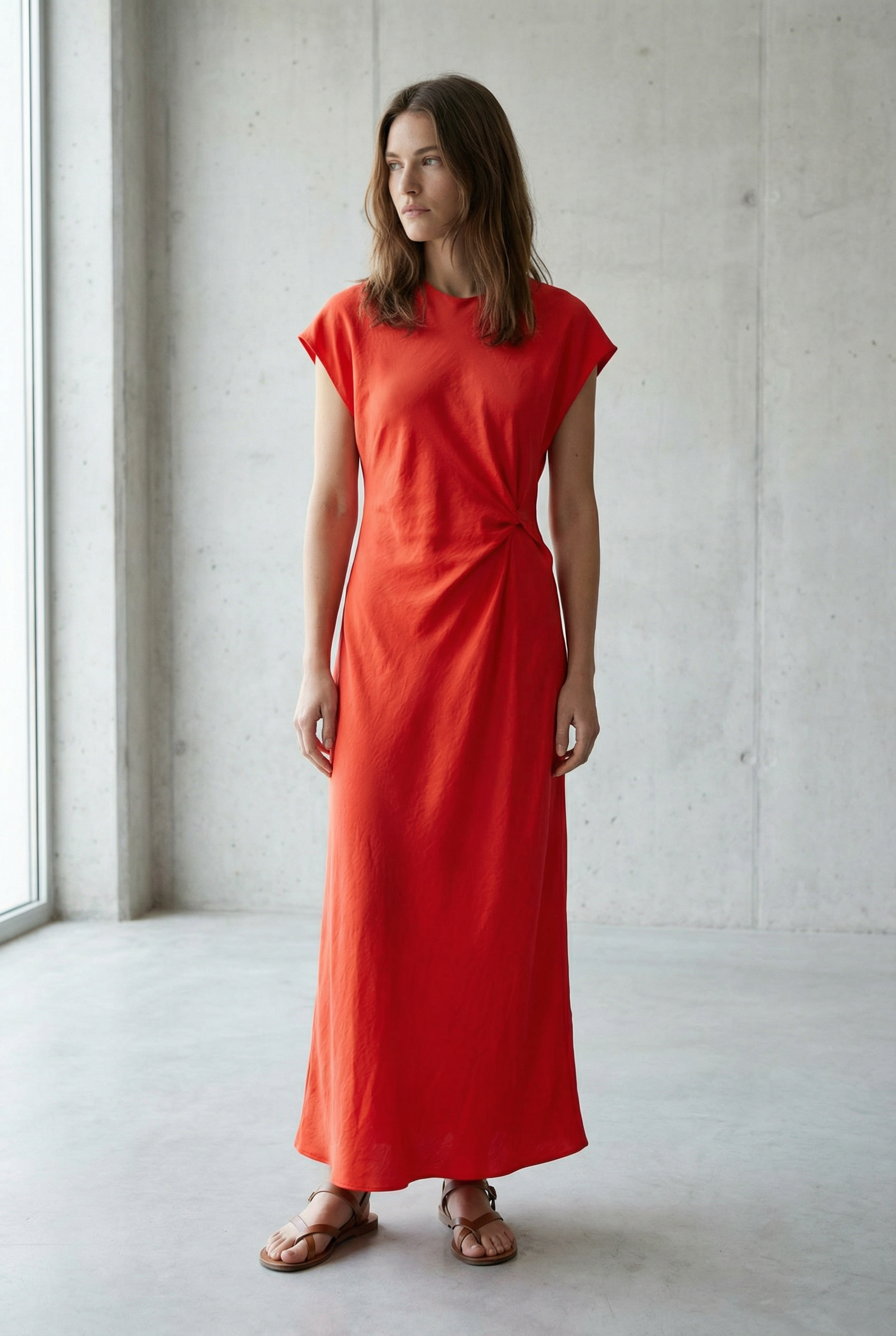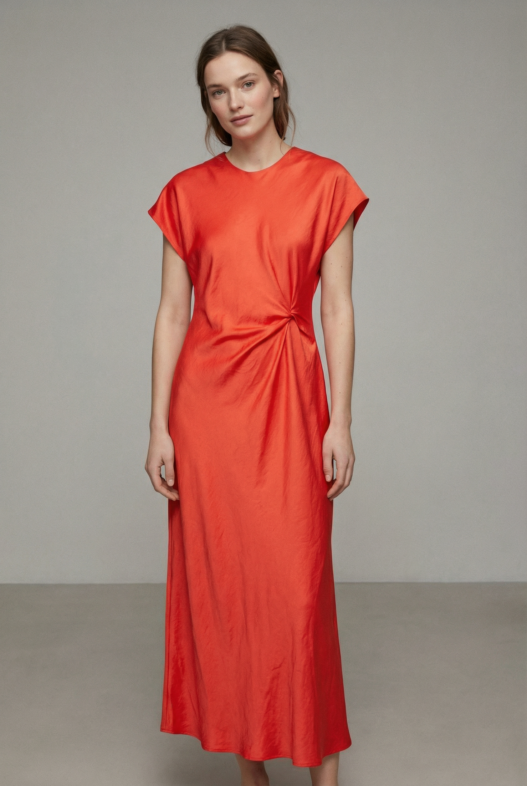 Elegante vestido largo naranja para mujer, drapeado en la cintura, ideal para ceremonia y noche.