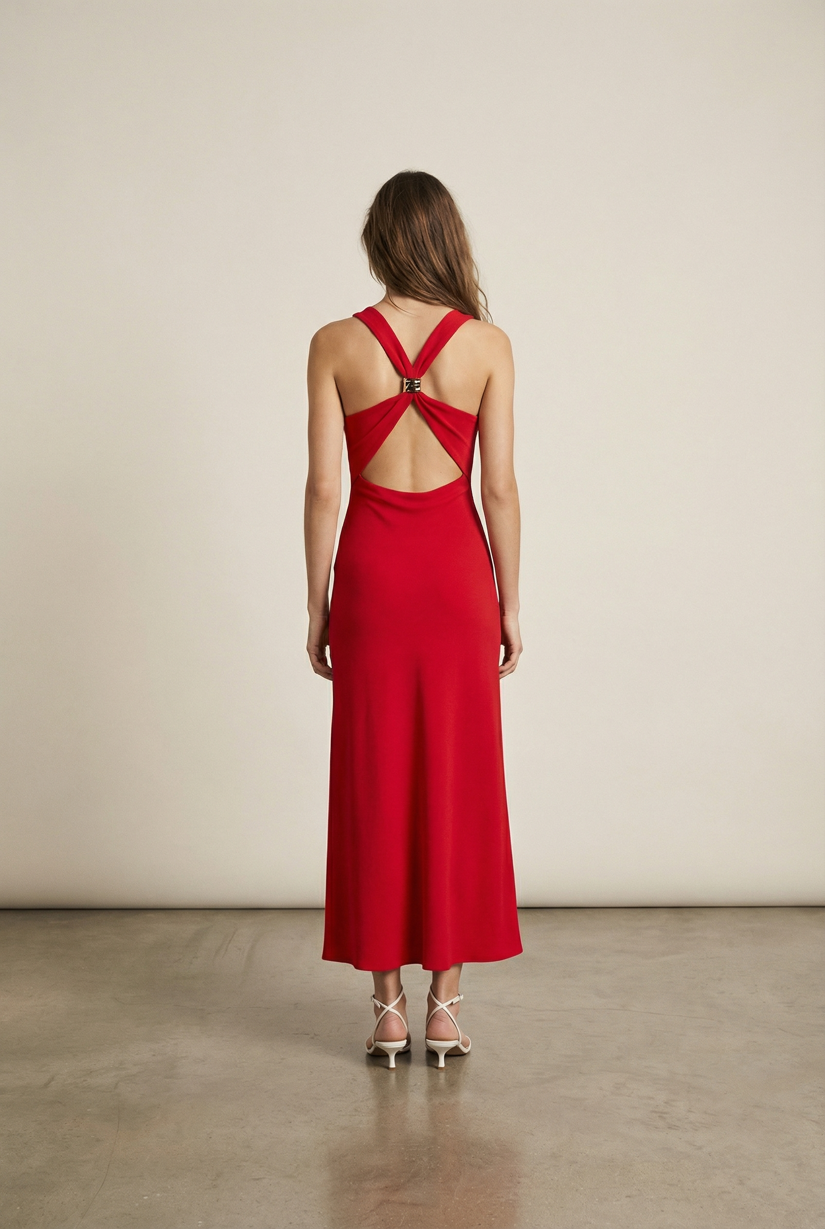 Elegante vestido largo sin espalda con detalle dorado para bodas civiles y veladas elegantes.