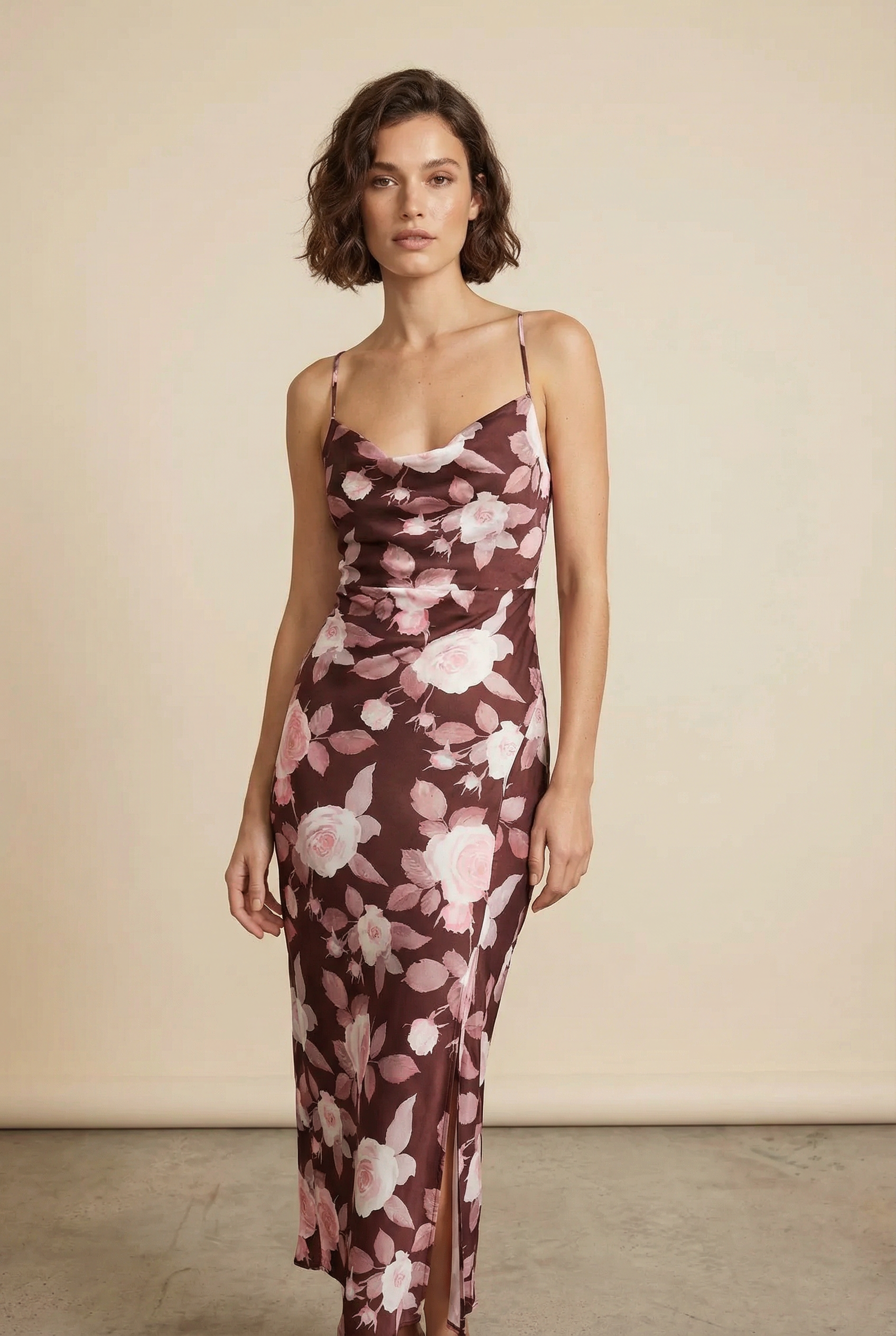 Vestido largo de raso con estampado floral y cuello b convertidor