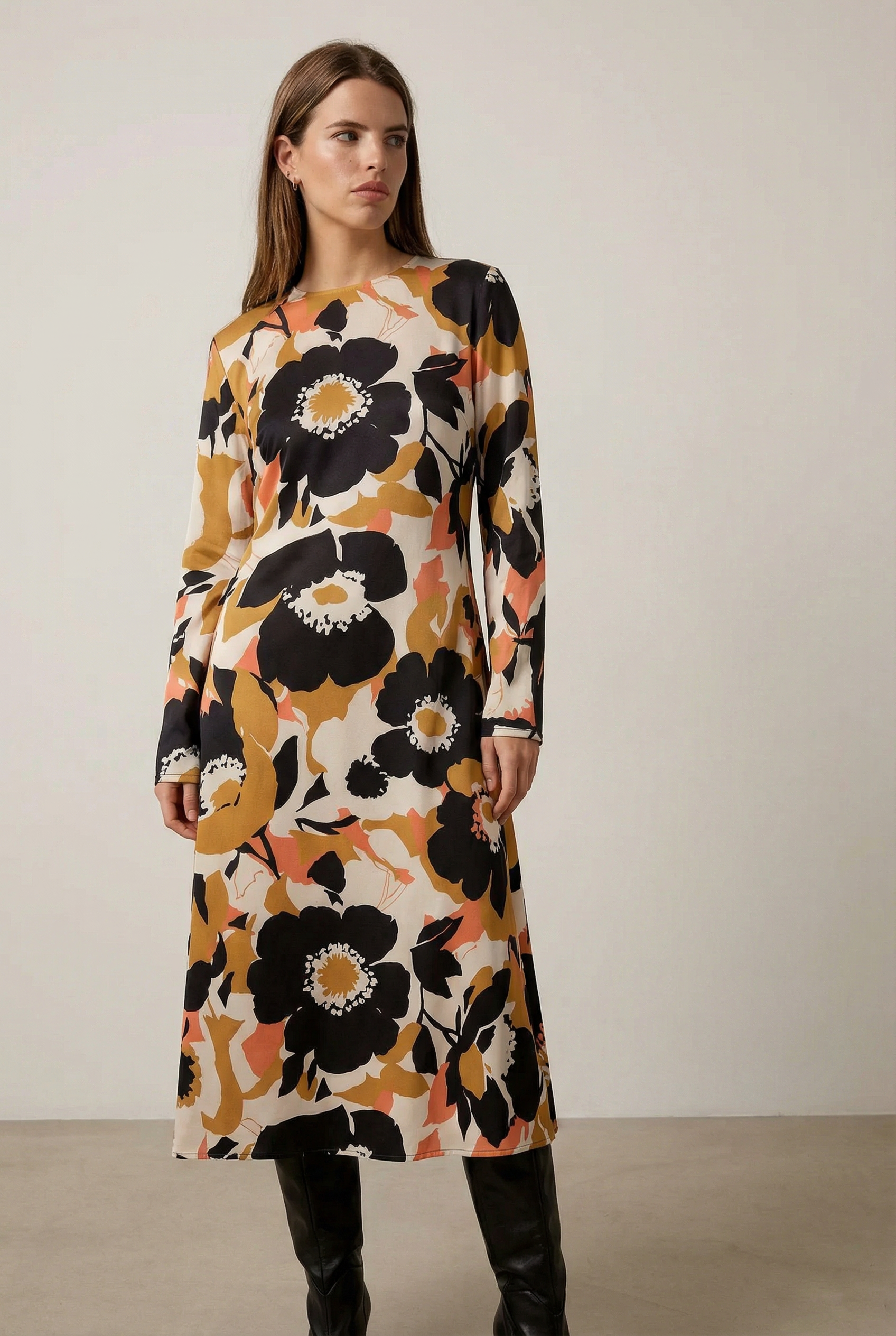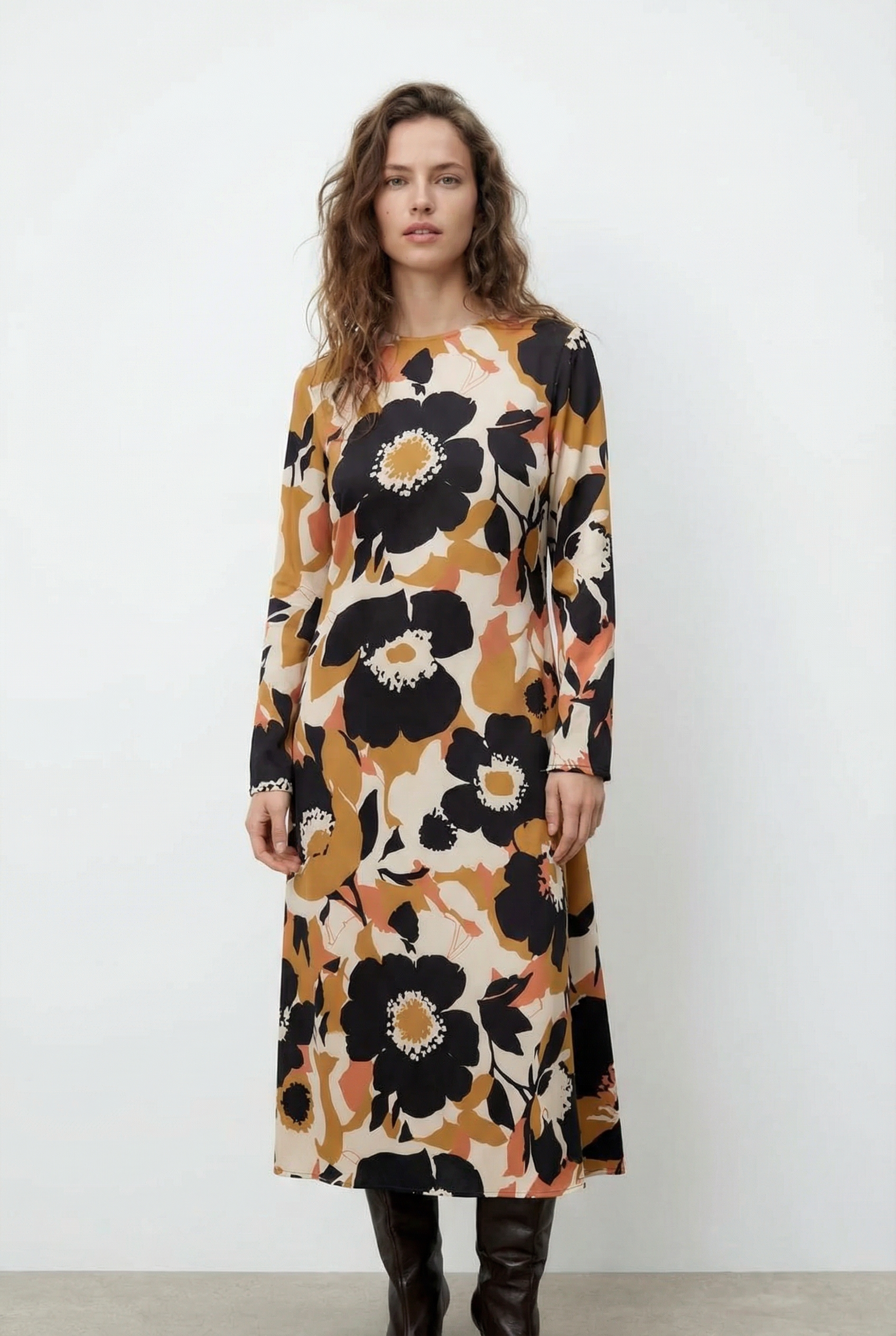 Elegante vestido midi con estampado floral multicolor, mangas largas y tejido fluido.
