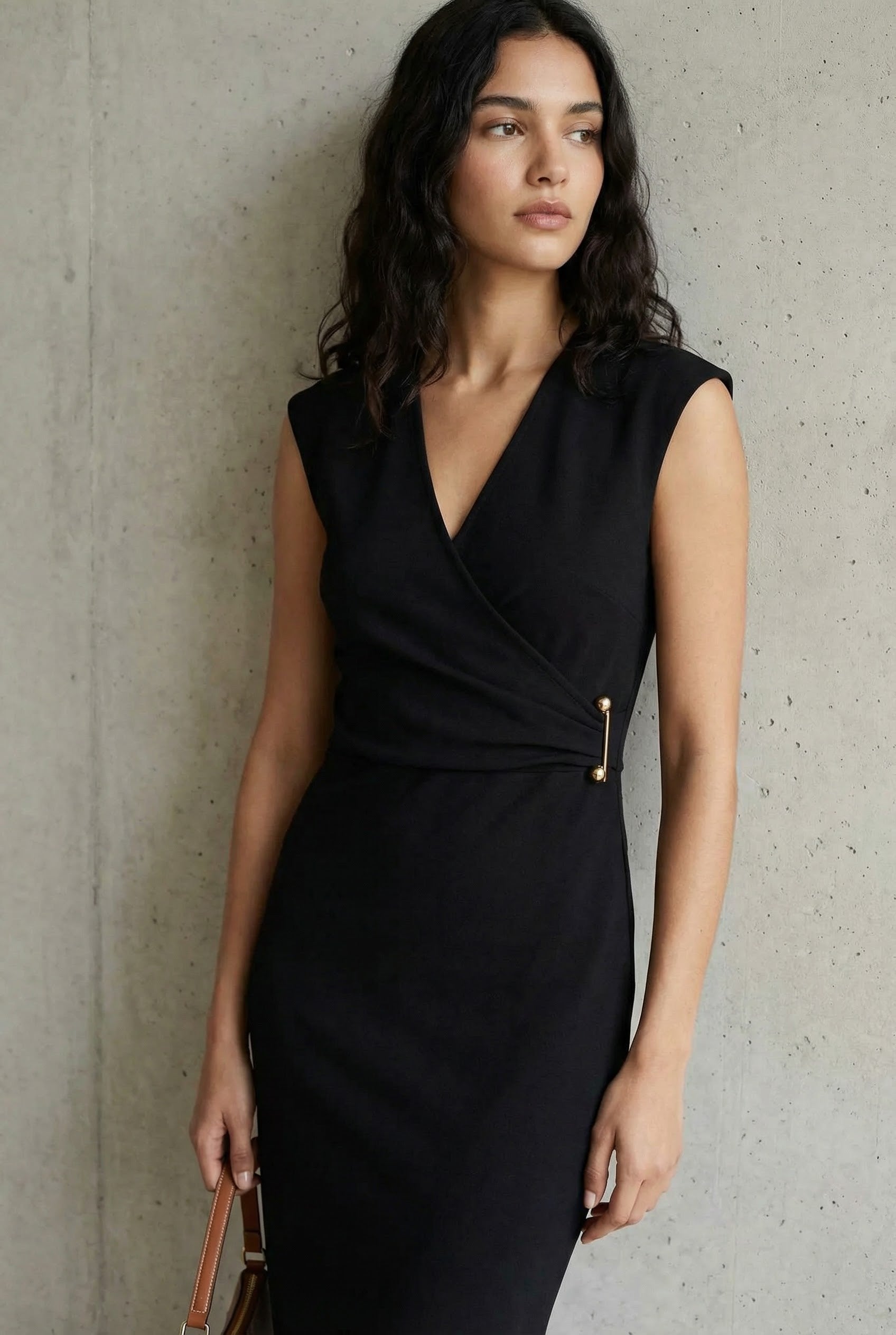Vestido cruzado con estampado geométrico para mujer en negro y marrón: elegancia y comodidad.