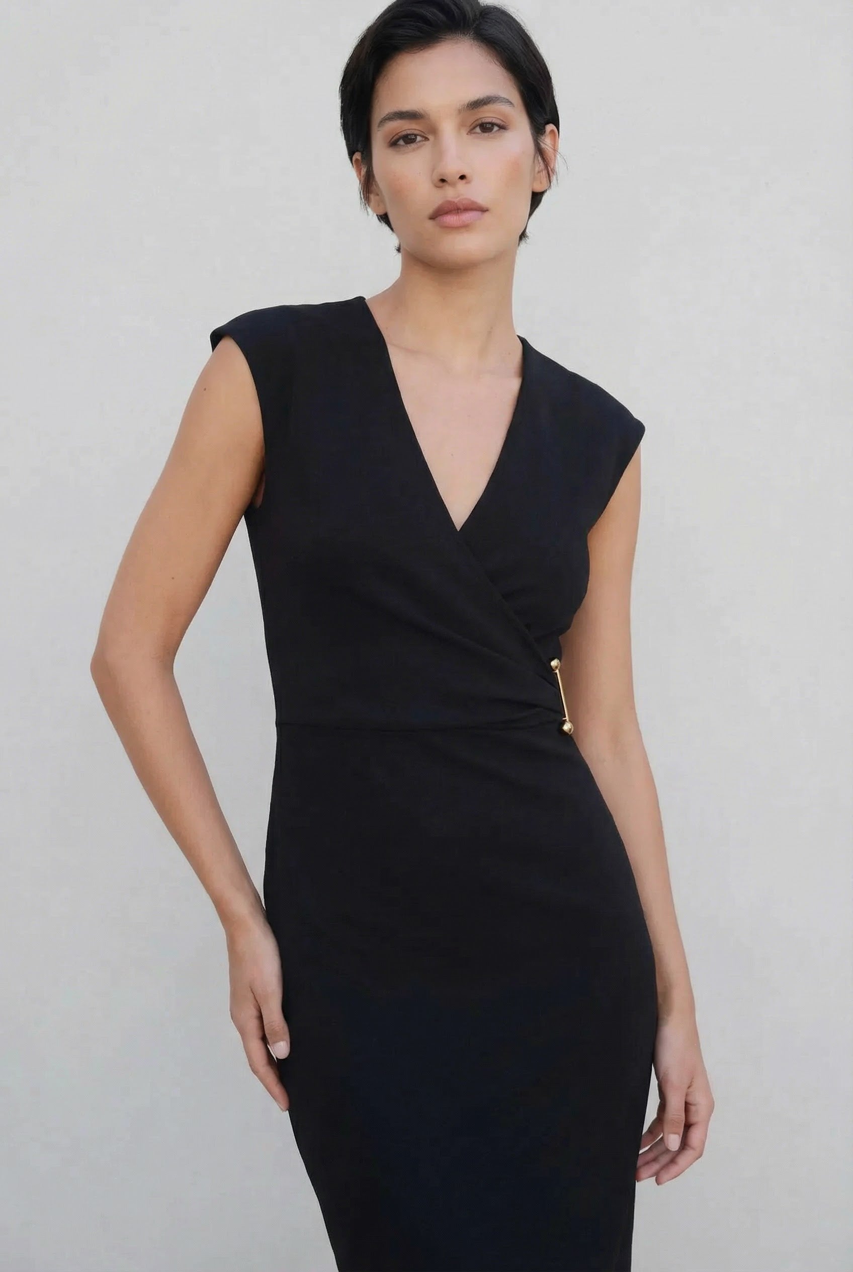 Elegante vestido midi negro con detalles dorados: escote corazón y corte ajustado.