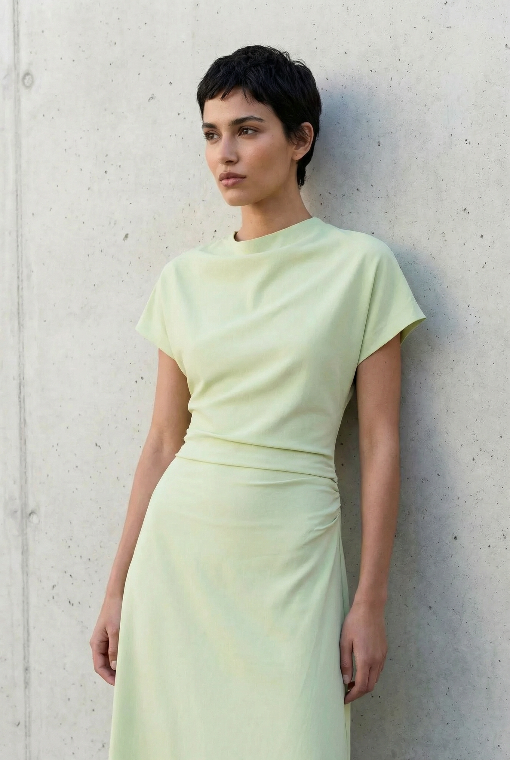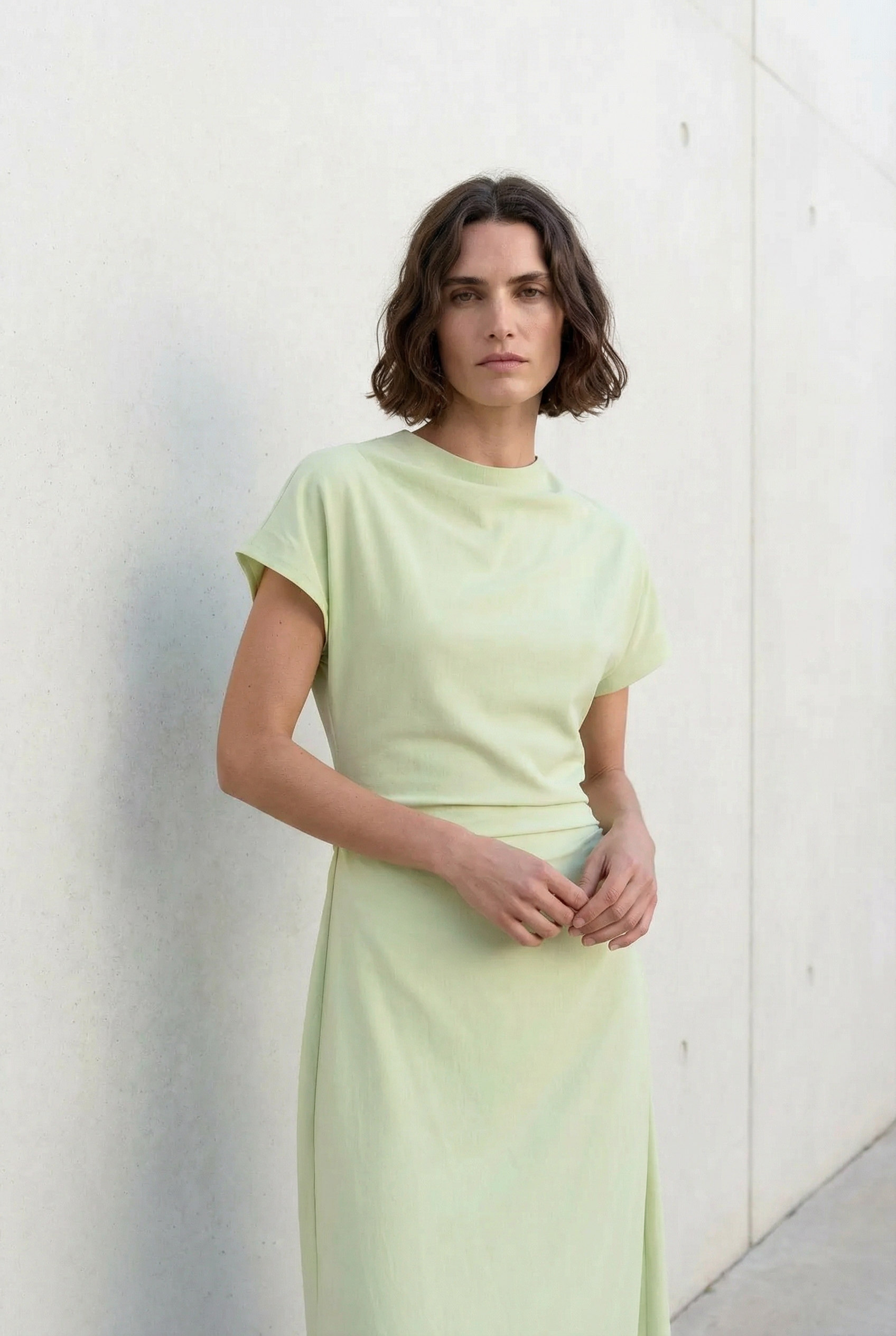 Vestido midi plisado verde pastel con abertura: elegancia y comodidad para cualquier ocasión.