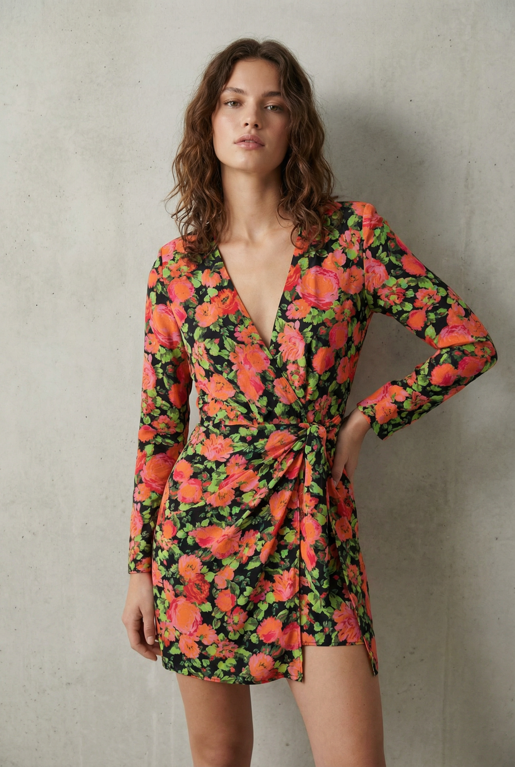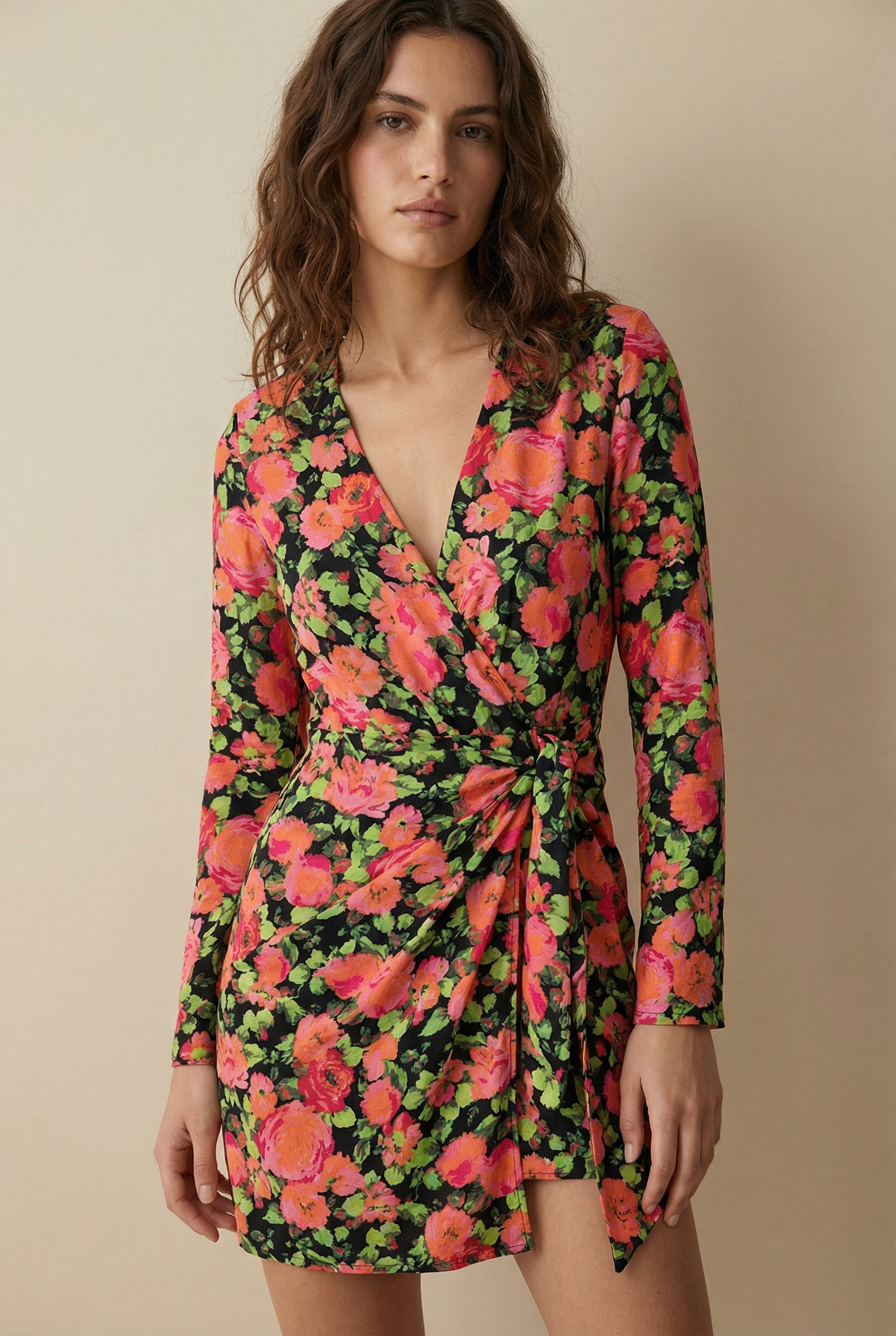 Vestido cruzado floral negro y rosa para mujer, corto, de manga larga y escote en V.
