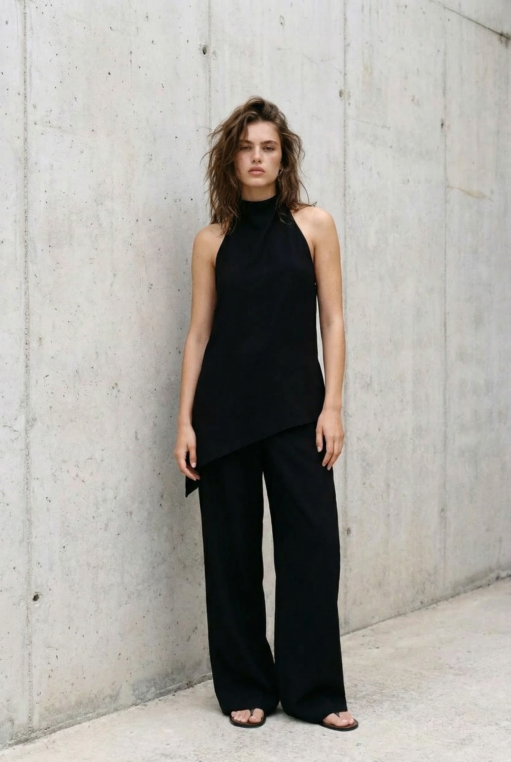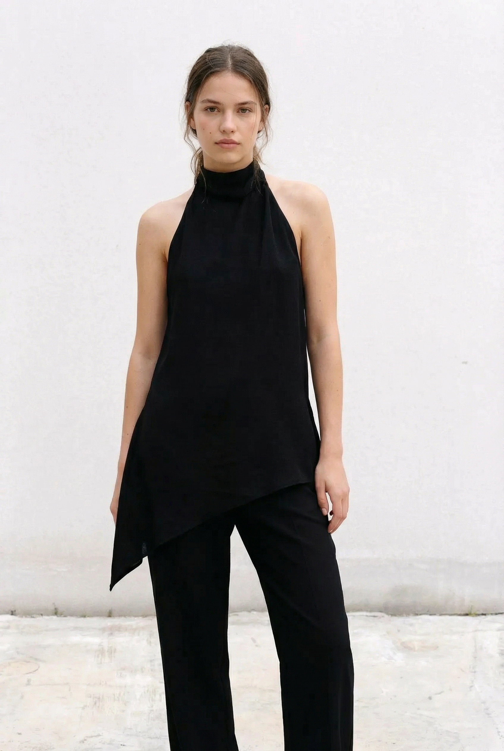Top largo elegante negro con espalda descubierta y cuello halter para mujer: elegancia minimalista para tu estilo.
