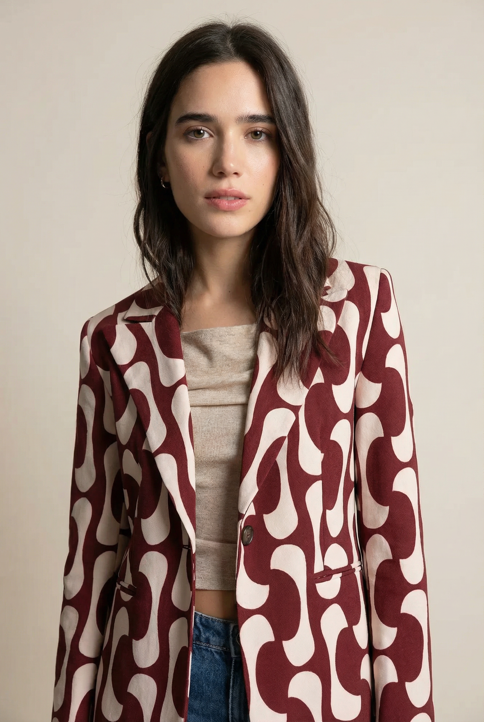 Blazer mujer estampado paisley beige con pantalón culotte a juego
