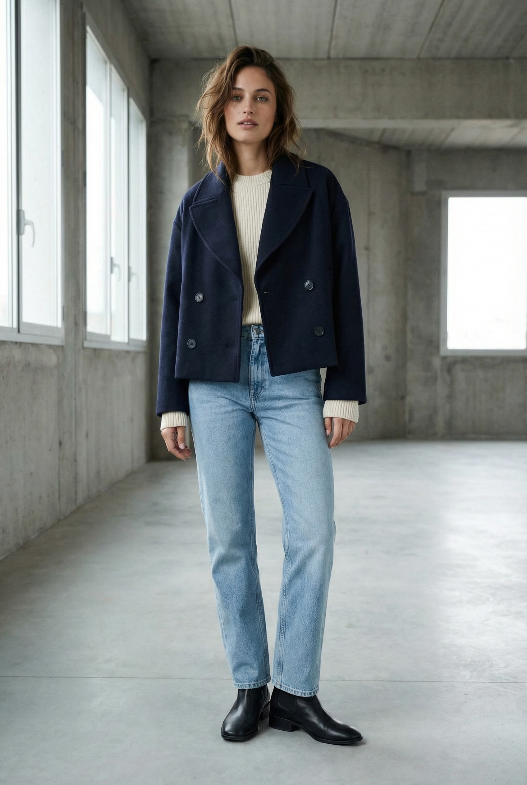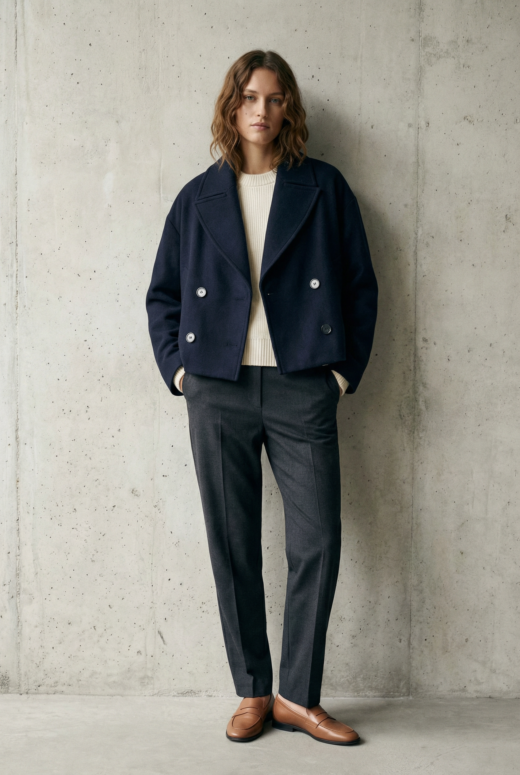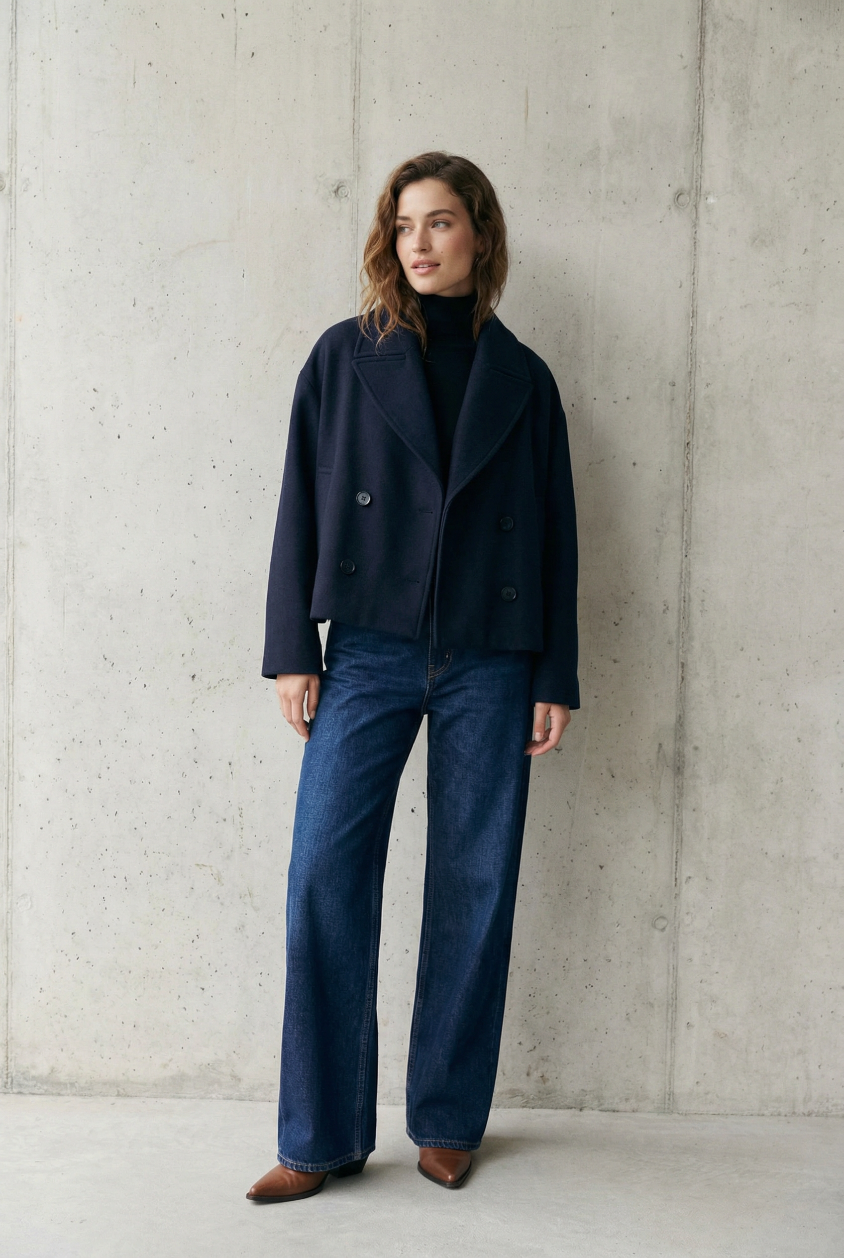 Abrigo corto azul marino elegante para mujer con corte holgado y cuello de solapa ancho