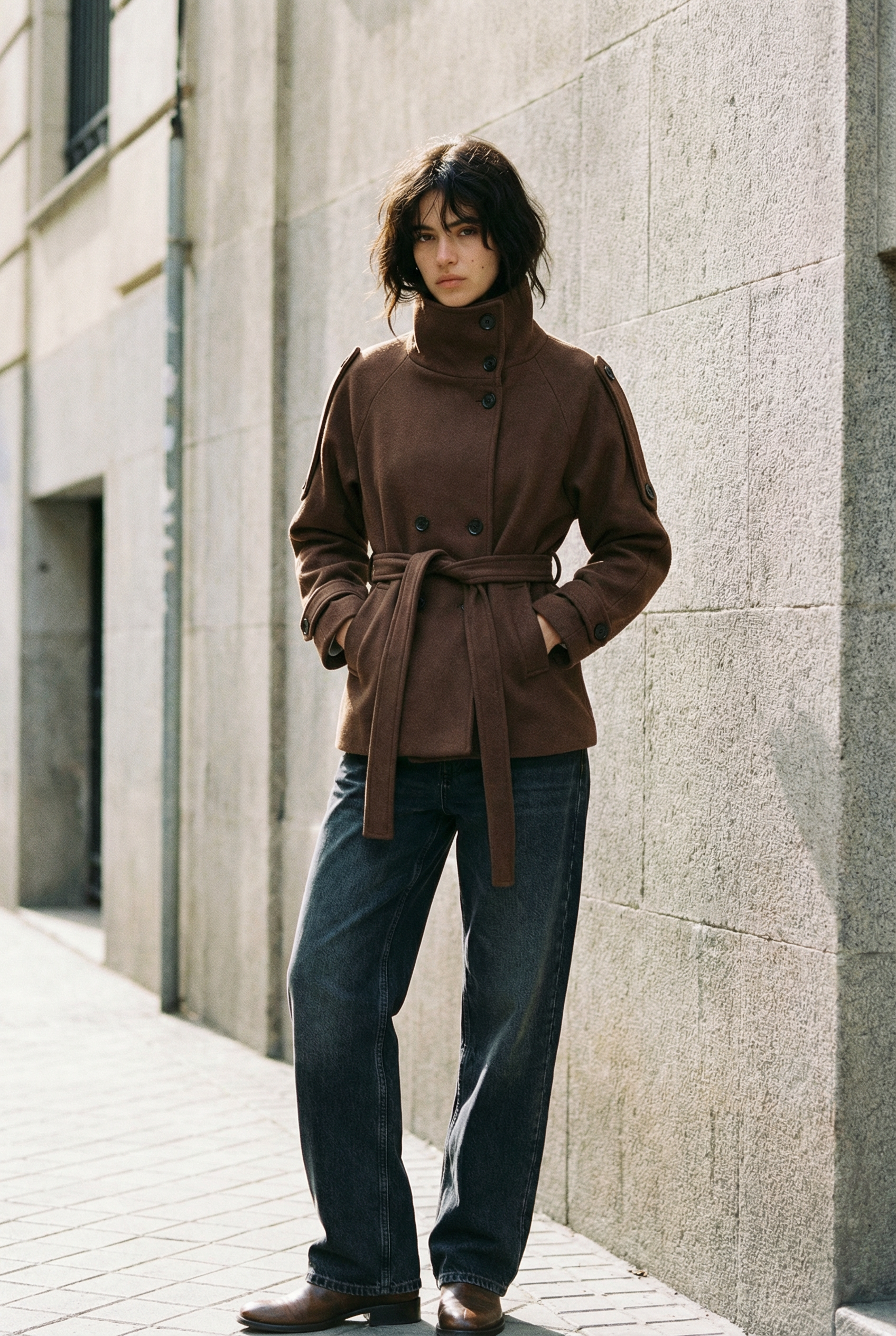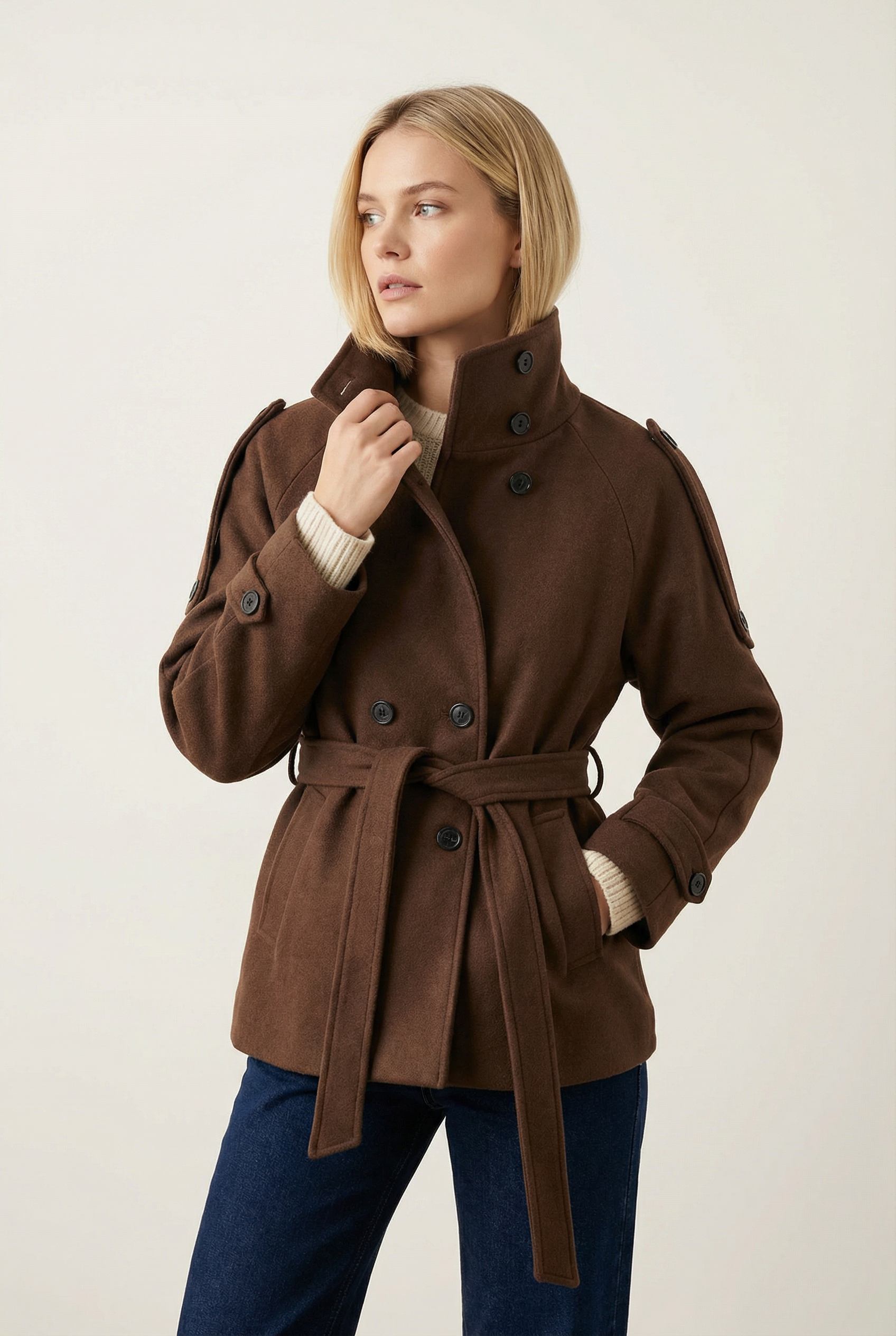 Gabardina corta cruzada beige para mujer: elegancia minimalista y comodidad para entretiempo.